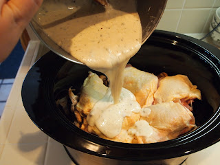 I'm so happy I ended up making this chicken. While there were a few things I'll do differently next time, it was definitely a delicious meal, and it was also the easiest meal I've ever made in the slow cooker. The ingredients are really interchangeable, you don't have to use exactly what I did. For instance, you can use whatever flavor cream cheese you want (or plain w/sauteed onions and garlic?), use white wine instead of chicken broth, change out the flavor of soup if you don't like cream of mushroom (I'll be doing this next time since I thought it gave the entire meal a canned flavor). You could also use different kinds of mushrooms or a different cut of chicken. I actually had to go in before serving this and pull out the skins and bones from the thighs. Next time I might just use boneless skinless thighs or breasts to see if it makes any difference.